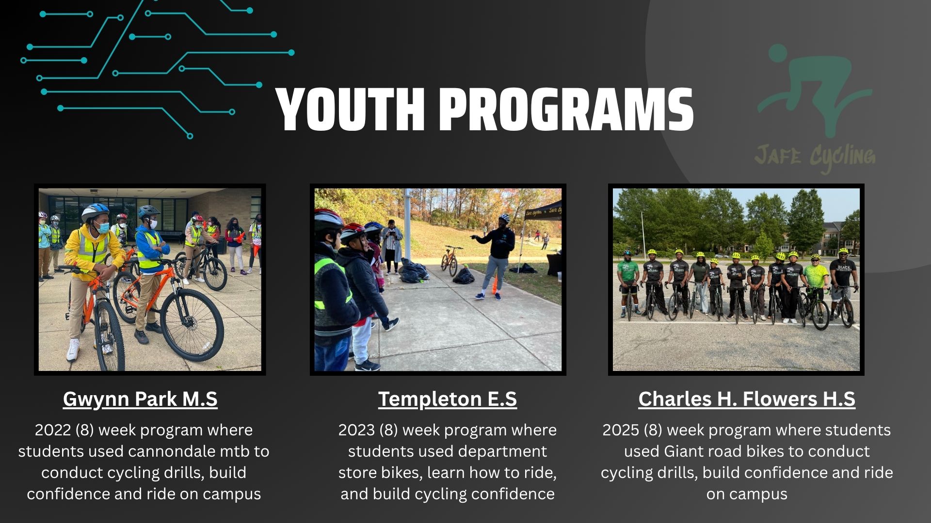 - Workforce Development: Provide internships and job placement through partnerships with Jafe Cycling’s Bike Shop retail operations.